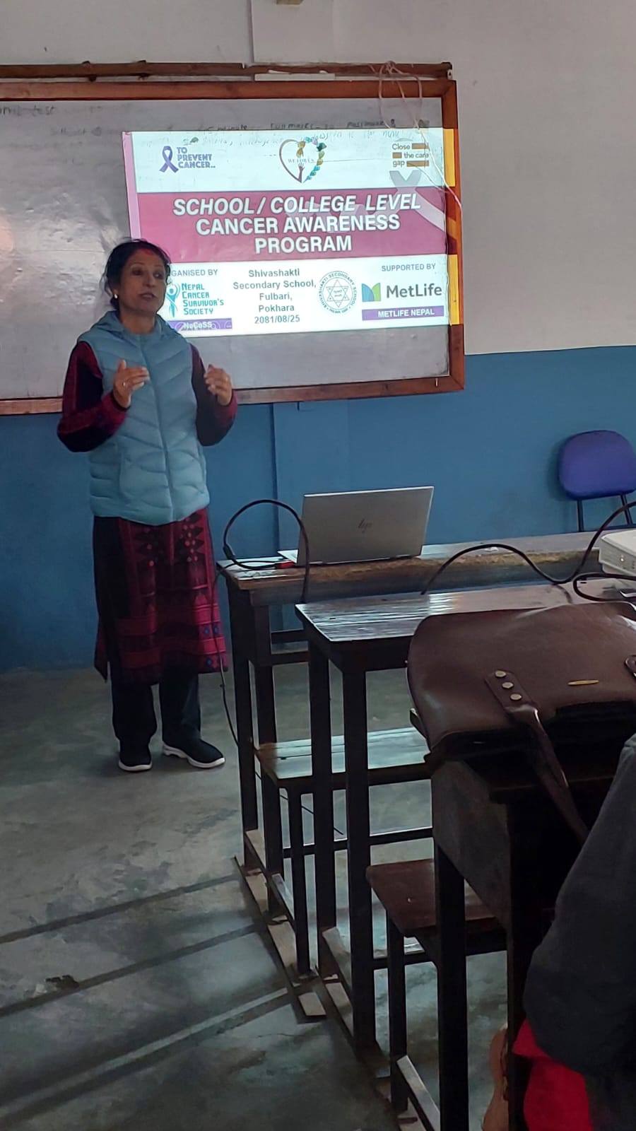 A School/College Level Cancer Awareness program was successfully held at Shivashakti Secondary School, Pokhara-11, Kaski, with valuable support from MetLife Nepal. The session, facilitated by Dr. Sanjeev Poudel, focused on raising awareness about cancer prevention, early detection, and promoting healthy lifestyle practices among students and educators.